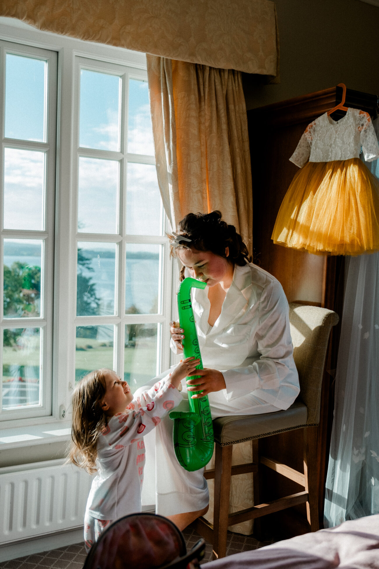 Flower girls looking in the mirror at Killashee Hotel. Wedding at Killashee Hotel, candid wedding photographer